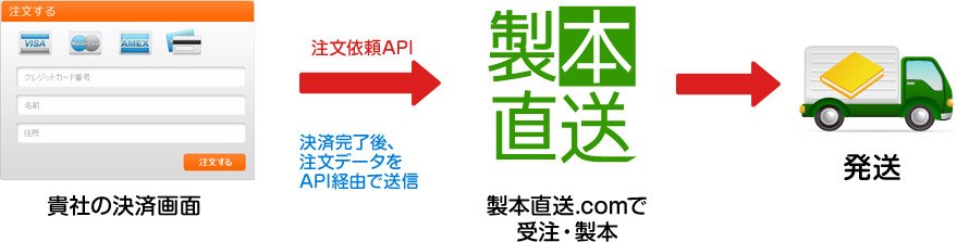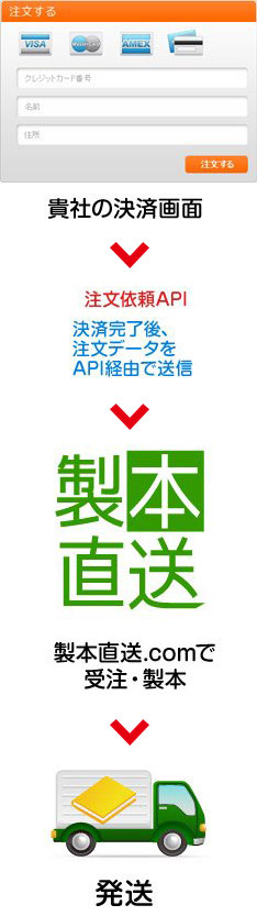 製本を有料で販売する場合は、お使いの決済手段と『注文依頼API』を連携させることで、決済完了後に製本直送.comに注文を出すことができます。