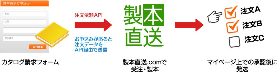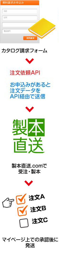 カタログ請求のフォームをご用意いただき、フォームの送信後に『注文依頼API』を使って製本直送.comにデータを送信することで、製本直送.comに注文を出すことができます。