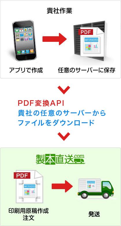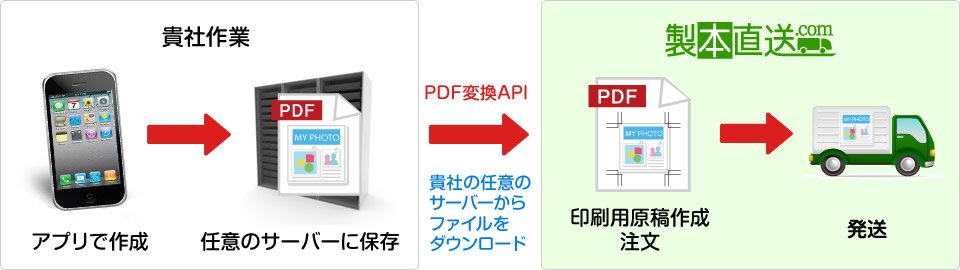 フォトブックアプリでユーザーが作ったPDFを製本直送.comに送信。製本直送.comが製本し、ユーザーにお届けします。