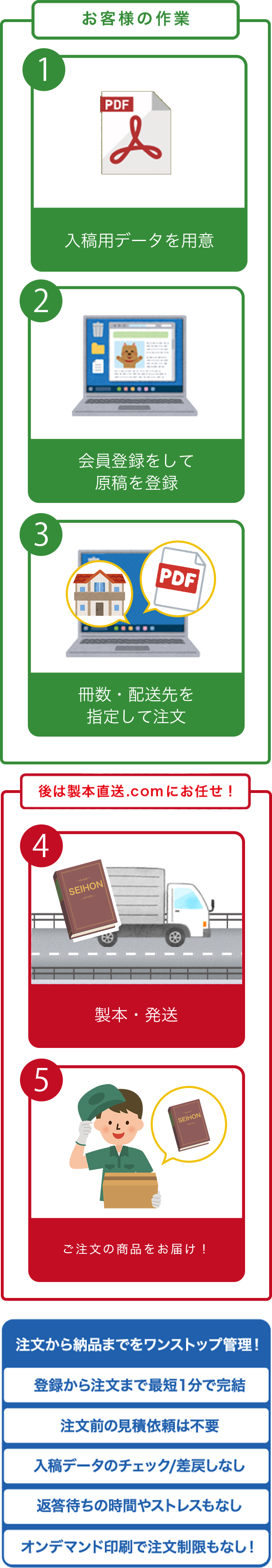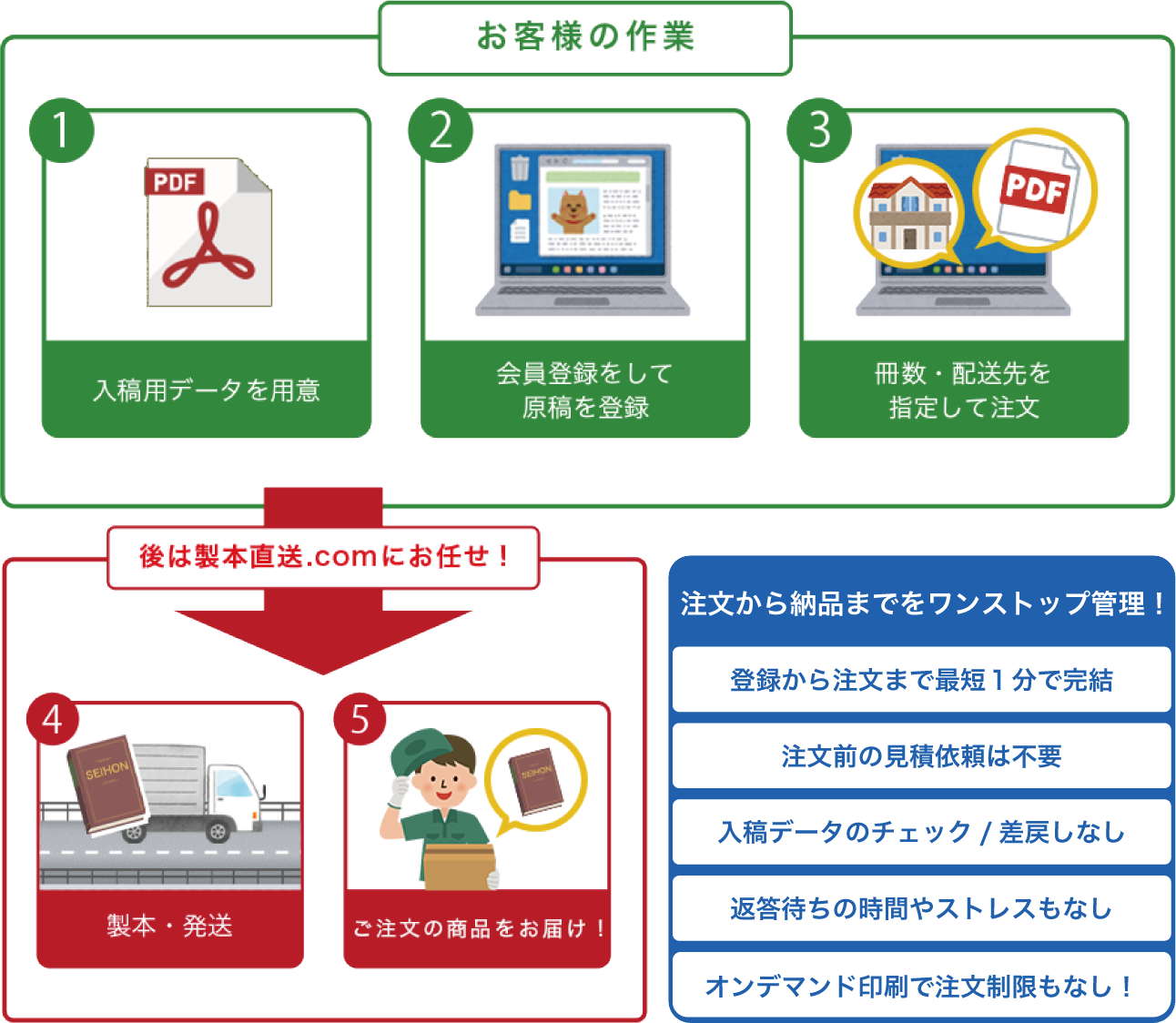 製本直送.comは、お客様の印刷したいデータを1冊から印刷・製本してお届けするサービスです。
